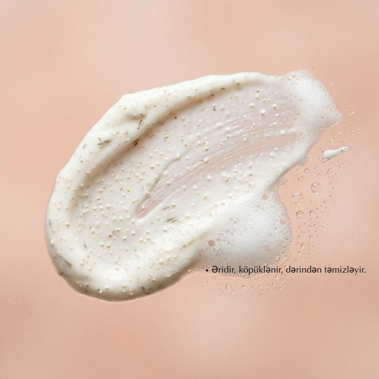 Kifayət qədər məhsulu nəm əllərinizə sıxın və üzünüzə yüngül dairəvi hərəkətlərlə masaj edin. Bu mərhələdə nişasta qranulları ölü hüceyrələri zərifcə peeling edəcək. Daha sonra su əlavə edərək zəngin təmizləyici köpüyə dönüşməsini təmin edin, məsamələri yaxşıca yuyun və bol ilıq su ilə durulayın. Dəriniz dərhal təmizlənmiş, nəmə doymuş və yumşaq hiss edəcək.