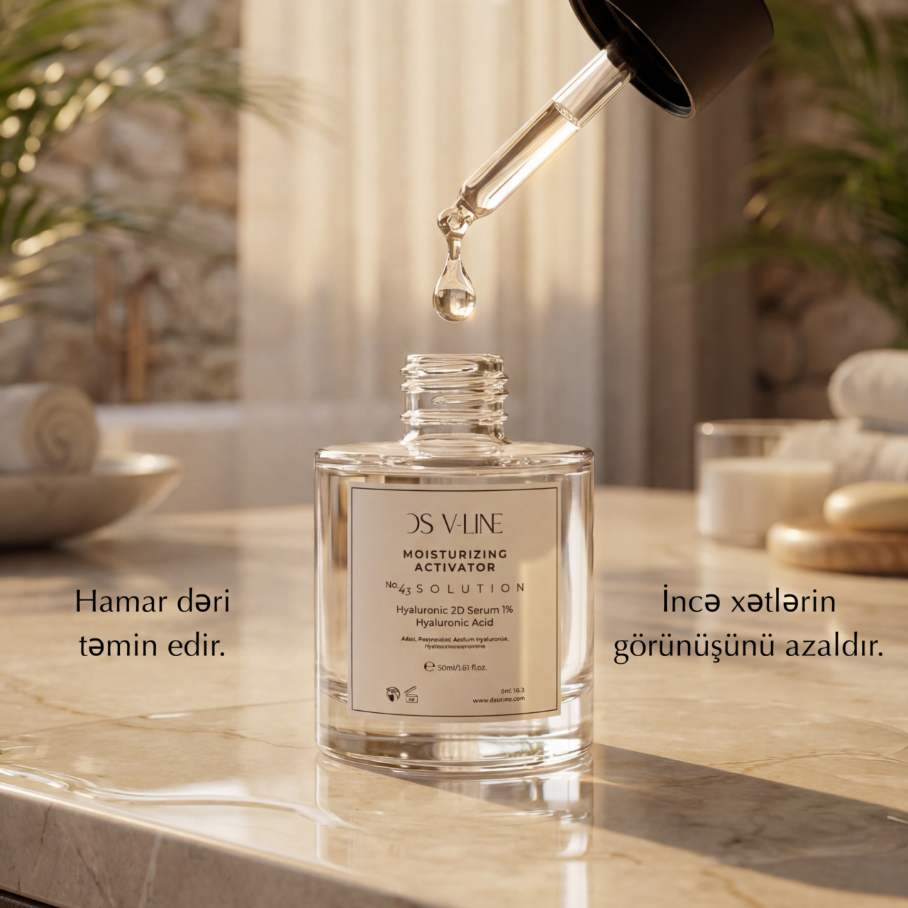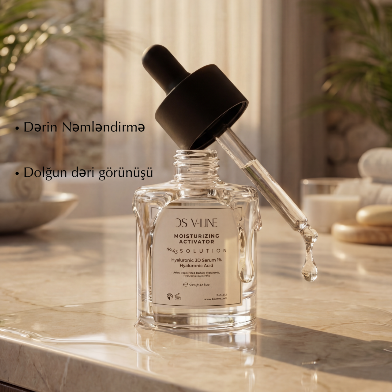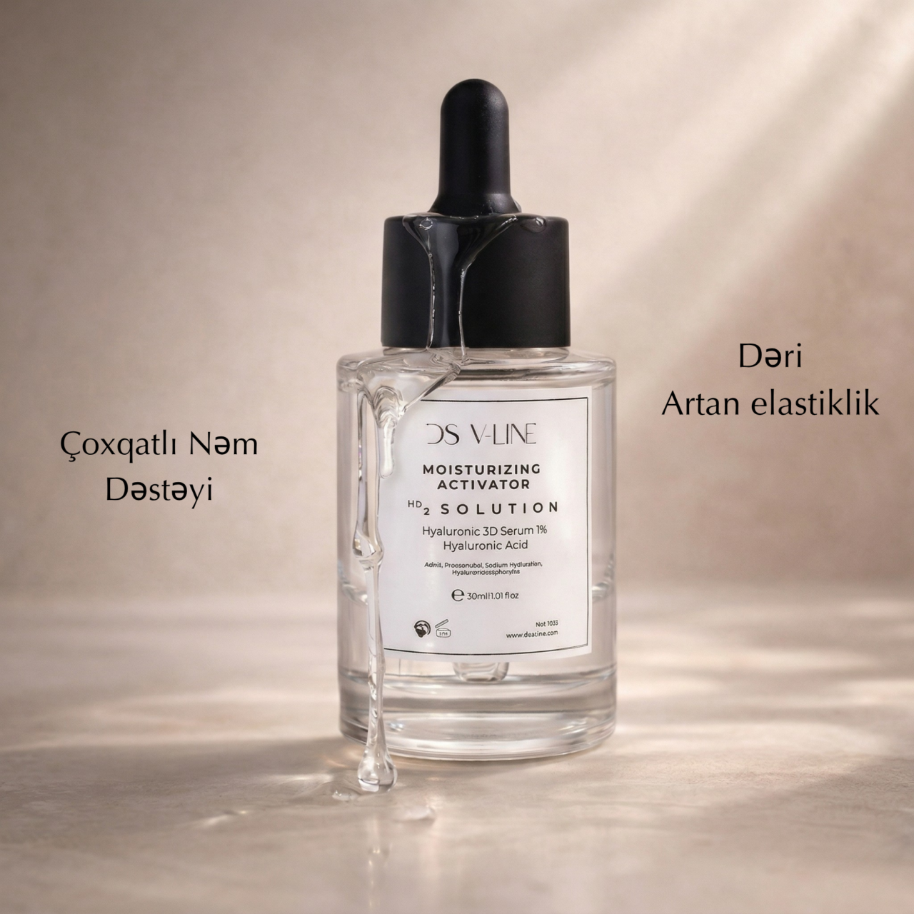 3 fərqli molekulyar ağırlıqda hialuron turşusu ehtiva edən DS V-LINE 3D Hyaluronic Acid Serum ilə dərinin bütün təbəqələrini dərindən nəmləndirin. İncə cizgiləri azaldan və elastikliyi artıran bu zərdab sizə gənc, dolğun və parlaq bir dəri bəxş edir.