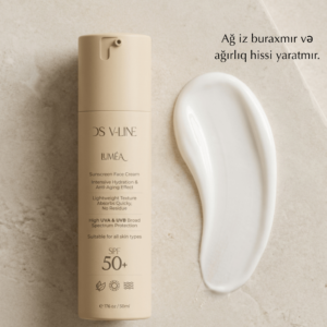 Bu krem SPF 50+ səviyyəsində yüksək qoruma təmin edir, tərkibindəki Hialuron turşusu, Kollagen və E vitamini sayəsində dərini həm nəmləndirir, həm də yaşlanma əlamətlərinə qarşı mübarizə aparır. Yüngül teksturaya malikdir və dəridə ağ iz buraxmır.